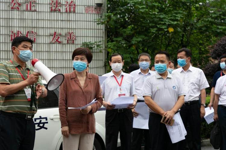 7月6日下午,一场模拟高考中发现体温异常及疑似感染新冠肺炎病毒考生处置的防疫演练在岳阳市四中举行。市委副书记、市长李爱武,省教育厅副厅长王玉清,副市长李为,市政府秘书长刘传汉、副秘书长陈文亮、市教体局局长王德华、市招考委员会组成单位的有关主要负责人及市直各考点的主考、副主考,送考学校的主要负责人等相关领导和负责人到现场观摩。