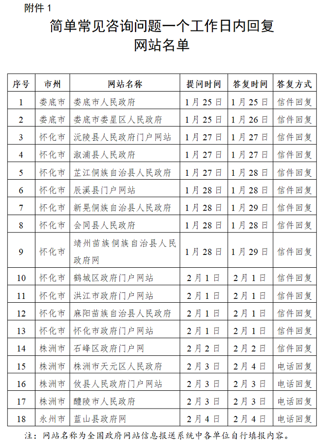 (三)举一反三抓好问题整改。对此次通报的政府网站和政务新媒体存在问题,各地各部门要高度重视,举一反三做好整改。各地各部门政府办公室(厅)要切实履行监管职责,加强“全国政府网站信息报送系统”和“全国政务新媒体信息报送系统”的信息更新工作,实现政府网站和政务新媒体应报尽报、应管尽管、信息完整、运行状态准确。各级政府网站主办单位要进一步完善网民意见建议的审看、处理和反馈等机制,定期整理网民咨询及答复内容,按照主题、关注度等进行分类汇总和结构化处理,编制形成知识库,实行动态更新,实现简单常见咨询问题1个工作日内答复。各单位问题整改情况请于2021年4月30日前书面反馈省政务局,省政务局将对整改情况进行复核。(联系人:郑锵,联系电话兼传真:0731—89990430)