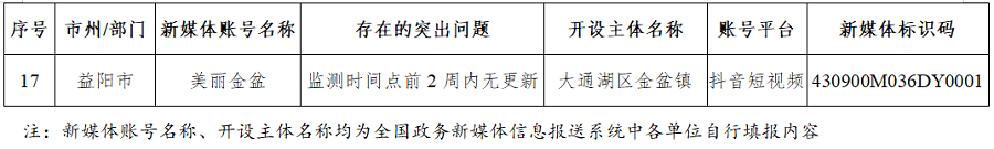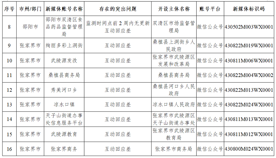 (三)政务新媒体运维管理仍需规范。本季度检查共有17家政务新媒体存在突出问题,9家互动回应差,其中张家界市“武陵源发改”、“凉水口镇”微信公众号在2020年四季度被通报互动回应差问题后整改不及时,本季度检查问题仍然存在;9家政务新媒体监测时间点前2周内无更新,其中“邵阳市双清区食品药品监督管理局”微信公众号自2018年9月后未进行更新,长期处于“睡眠”状态。