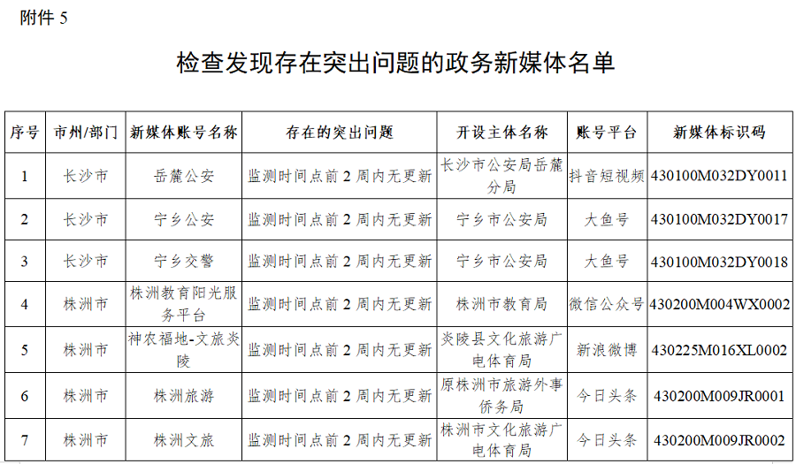 (一)政府网站和政务新媒体监管工作整改不到位。湖南湘江新区网站、信用邵阳网站未纳入全国政府网站信息报送系统管理;湖南湘江新区网站(www.hnxjxq.gov.cn)、如法网(www.rufa.gov.cn)非政府门户网站使用政府网站一级域名。株洲市、郴州市等市州在全国政务新媒体信息报送系统中仍有图书馆、气象局等非政府系统或全系统垂直管理的政务新媒体账号。