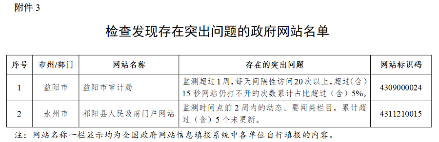 (二)政府网站运维保障存在薄弱环节。益阳市审计局网站3月9日至3月26日站点无法访问;祁阳县人民政府门户网站为所辖乡镇和县政府部门开设的动态要闻栏目2周内无更新,且发布的消息大多为转载上级政府门户网站信息,与各部门实际工作无关。