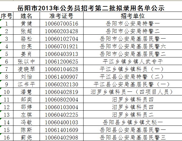 岳阳市2013年第二批公务员录用考察合格人员(拟录名单)公示