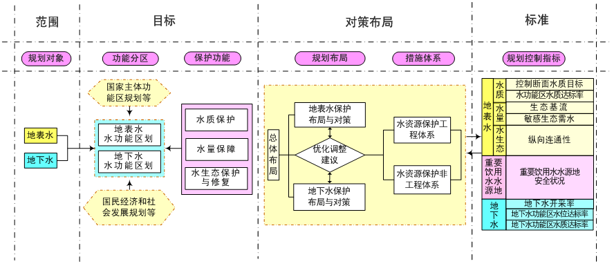 水质保护措施规划——开展水功能区现状水质达标分析,协调确定水功能区水质达标率目标;在核定水功能区纳污能力的基础上,确定污染物入河控制量,并提出分解技术方案;制定入河排污口布局与整治措施;提出内源治理与面源控制要求;统筹提出重要饮用水水源地保护措施及应急备用方案;合理确定地下水功能区水质保护目标,制定地下水水质保护方案与措施。