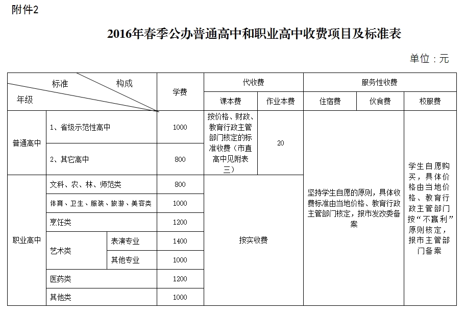 2.2016年春季公办普通高中和职业高中收费项目及标准表