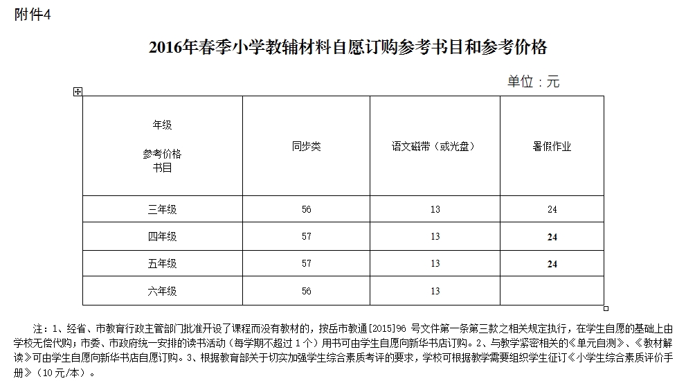 4.2016年春季小学教辅材料自愿订购参考书目和参考价格