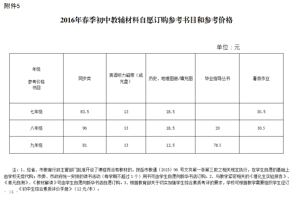 5.2016年春季初中教辅材料自愿订购参考书目和参考价格