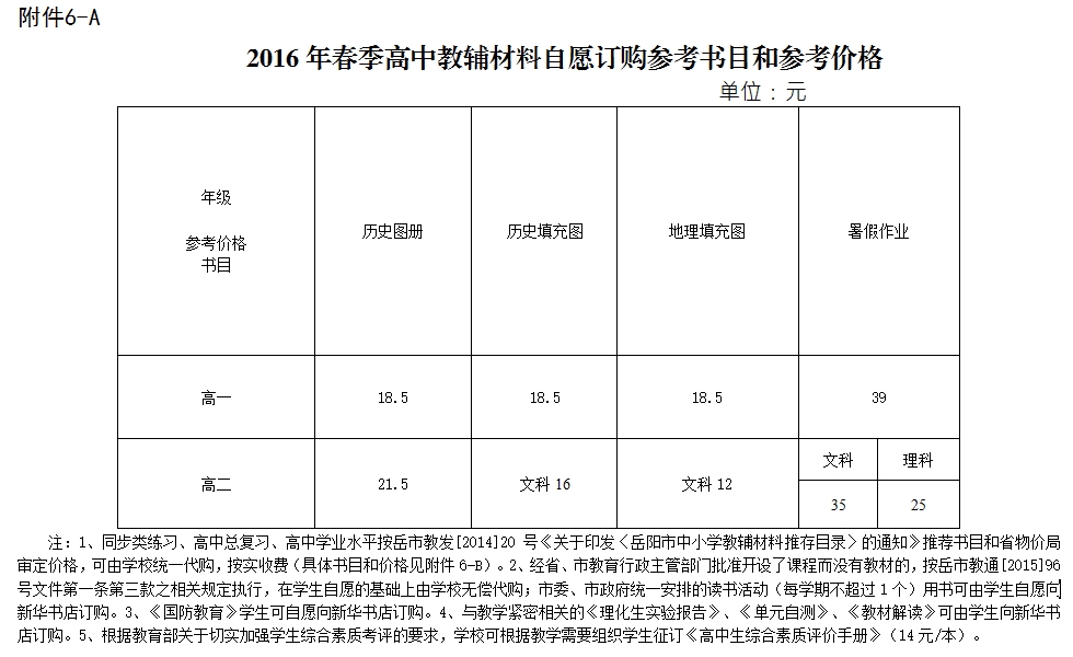 1、中小学的教辅材料征订选用要严格按照省物价局、省新闻出版局、省教育厅《关于加强中小学教辅材料价格监管的通知》(湘价教〔2012〕93号),湖南省发改委、湖南省新闻出版局《关于下达2015年秋季中小学教材和教辅材料价格的通知》(湘发改价费〔2015〕694号),岳阳市教育局、岳阳市文化广电新闻出版局、岳阳市物价局、岳阳市文化市场综合执法局《关于印发〈岳阳市中小学教辅材料推荐选用管理办法(试行)〉的通知》(岳市教发〔2014〕18号),岳阳市教育局《关于印发〈岳阳市中小学教辅材料推荐目录〉的通知》(岳市教发〔2014〕20号),岳阳市教育体育局《岳阳市2016年春季中小学教科书、教学参考书目录》(岳市教通[2015]96号)的相关规定,进一步加强和规范教辅材料管理。任何部门、单位和个人不得在教辅材料编写、出版、发行等环节,以协助工作为由拿取折扣、索要赞助等方式违规收取费用。教辅材料的征订工作要认真落实好学生或家长自愿订购的原则,严禁强制或变相强制征订和收费,严禁收费后不订或少订行为的发生(新华书店是教辅材料唯一发行单位)。对家庭困难的学生要适当减免教辅材料费。2016年春季教辅材料自愿订购参考书目和参考价格见附表四、附表五、附表六。