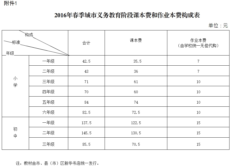 1.2016年春季城市义务教育阶段教材费和作业本费构成表