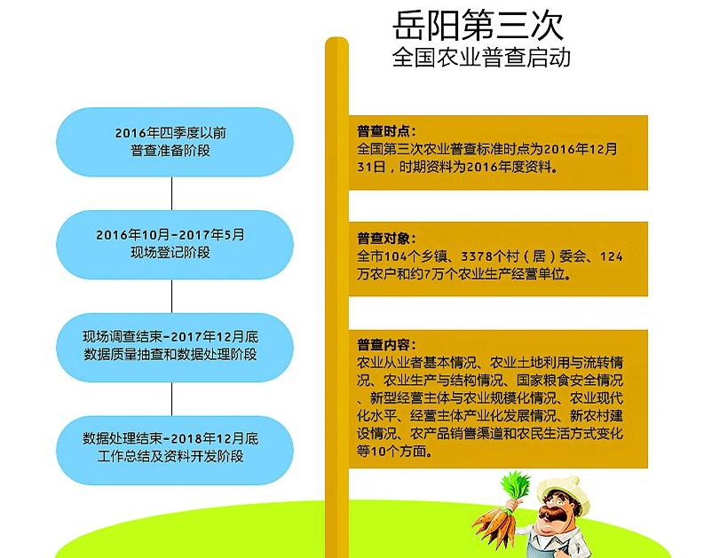全市农业普查大约需要3年时间。市政府已经成立了岳阳市第三次全国农业普查领导小组并开展工作。大部分县市区也组建了“三农普”工作班子,分解了工作责任,落实了专项经费,工作正在有序开展。整个普查工作分四个阶段:2016年四季度以前完成农业普查的各项准备工作;2016年10月到2017年5月完成农业普查的现场调查登记工作;现场调查结束到2017年12月底基本完成数据质量抽查和数据处理;2018年基本完成普查总结及资料开发。