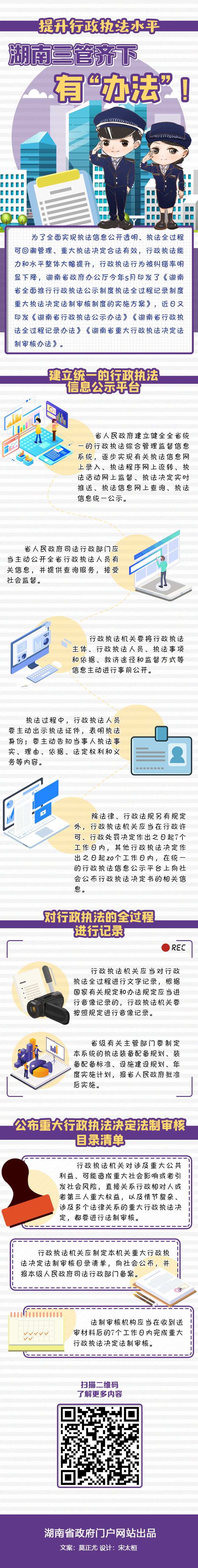 为了全面实现执法信息公开透明、执法全过程可回溯管理、重大执法决定合法有效,行政执法能力和水平整体大幅提升,行政执法行为被纠错率明显下降,湖南省政府办公厅今年5月印发了《湖南省全面推行行政执法公示制度执法全过程记录制度重大执法决定法制审核制度的实施方案》,近日又印发《湖南省行政执法公示办法》《湖南省行政执法全过程记录办法》《湖南省重大行政执法决定法制审核办法》。