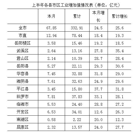 二是县市区规模工业增长较快。上半年,除市直以外,全市12个县市区规模工业企业完成工业总产值936.74亿元,同比增长38.0%;实现工业增加值244.26亿元,同比增长27.5%,高出全市平均水平1.9个百分点。其中,工业增加值增长较快的是云溪区、平江县,分别增长35.4%、31.8%。详见下表。