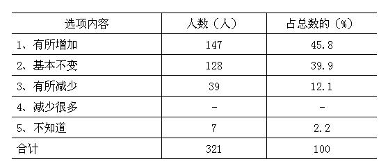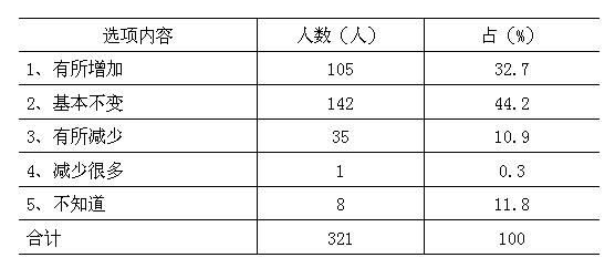调查结果显示:大多数居民对未来增加收入信心不足。44.2%的认为收入会“基本不变”,10.9%的认为收入会“有所减少”,还有11.8%的调查户对增加收入感到茫然。