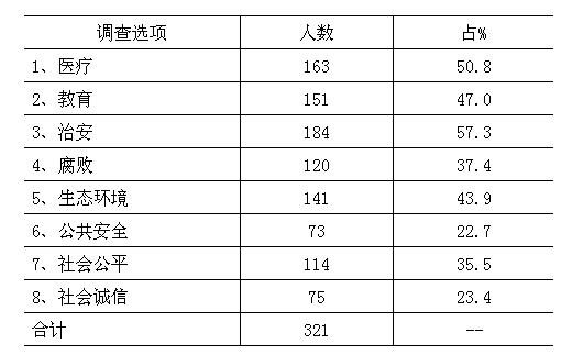 由此可以看出,居民在关注治安、医疗、教育和环境这些与自身生活密切相关的社会问题的同时,也不同程序地关注社会热点问题,如腐败、社会公平与诚信等问题。由此说明人们不仅要求共享改革发展的成果,提高生活水平和生活质量,也要求社会有更多的公平与正义。