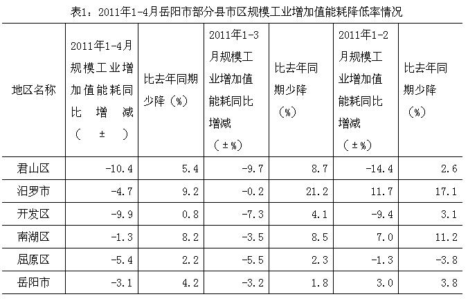 今年1-4月份,汨罗市、君山区、开发区、南湖区和屈原区合计能耗同比净增3.17万吨标准煤,拉动全市规模工业能耗同比增长1.2个百分点,比去年同期多拉动0.2个百分点,其中:汨罗市、南湖区和君山区规模工业增加值能耗分别比上年同期少降9.2、8.2和5.4个百分点。