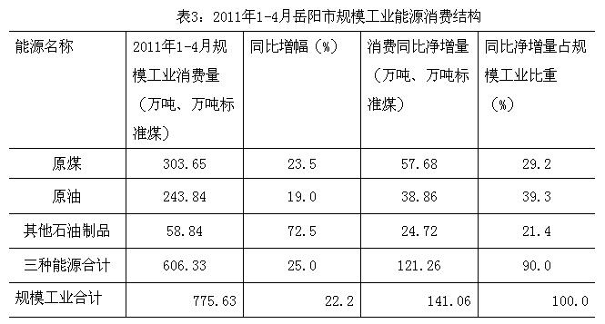 从重点耗能企业角度分析,截止今年4月份,全市71家重点耗能企业能耗合计为260.21万吨标准煤,占规模工业的81.6%,能耗同比增长16.4%,能耗同比净增36.73万吨标准煤,拉动规模工业能耗同比增长13.5个百分点。其中:华能湖南岳阳发电有限责任公司今年1-4月能耗同比猛增22.25万吨标准煤,中国石油化工股份有限公司巴陵分公司同比净增12.36万吨标准煤,湖南泰格林纸集团有限责任公司同比净增10.89万吨标准煤。以上三家企业能耗合计同比净增45.51万吨标准煤,占规模工业能耗净增量的95.8%,拉动规模工业能耗同比上升16.8个百分点。