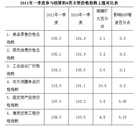 今年一季度我市6类(商品零售价格总指数、居民消费价格总指数、工业生产者出厂价格指数、在外用膳食品价格指数、固定资产投资价格指数、建筑安装工程价格指数)参与GDP核算的主要价格指数涨幅均超过5%,且都大大高于去年同期水平,影响了当期经济增速(见下表),经测算影响一季度GDP增速约1个百分点。其中(前提:假定所有物价指数为去年同期水平,变动其中一个指数,对第三产业及GDP的影响)商品零售价格总指数影响第三产业0.7个百分点,整个GDP0.3个百分点;居民消费价格总指数影响第三产业0.4个百分点,GDP0.2百分点。工业生产者出厂价格指数影响工业0.2个点,GDP0.1个点;在外用膳食品价格指数影响餐饮业10.1个百分点,第三产业0.5个百分点,GDP0.2个百分点;固定资产投资价格指数影响金融业速度1.4个百分点,第三产业0.1个百分点,GDP0.05个百分点;建筑安装工程价格指数影响建筑业速度5个百分点,第二产业0.3个百分点,整个GDP0.15个百分点。