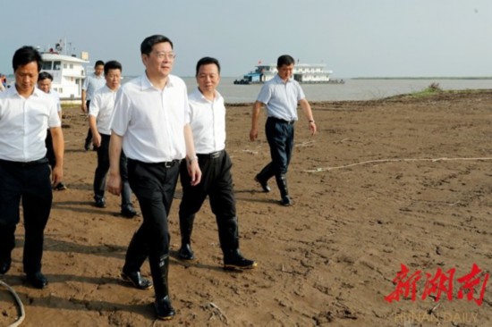 (2018年8月18日,省委书记杜家毫从岳阳湘阴乘船深入下塞湖,踏上洲滩,实地检查非法矮围拆除整治情况。湖南日报·华声在线记者罗新国摄 )