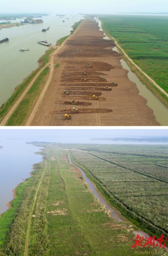 (上图: 2018年6月14日,沅江市漉湖芦苇场下塞湖非法矮围整治现场,约7200米的泥堤已被荡平。下图: 2019年10月31日,沅江市漉湖芦苇场下塞湖非法矮围拆除地已复绿。均为湖南日报·华声在线记者 傅聪 摄)