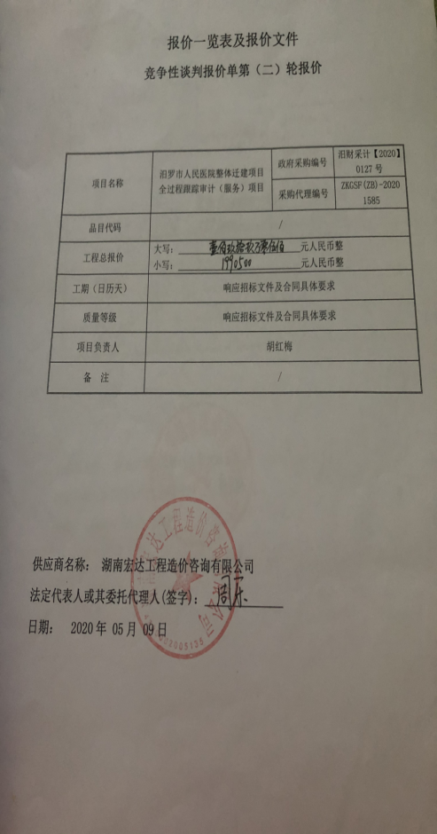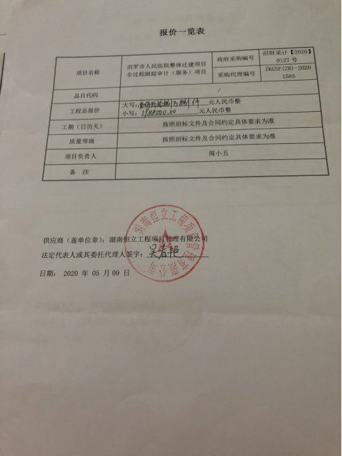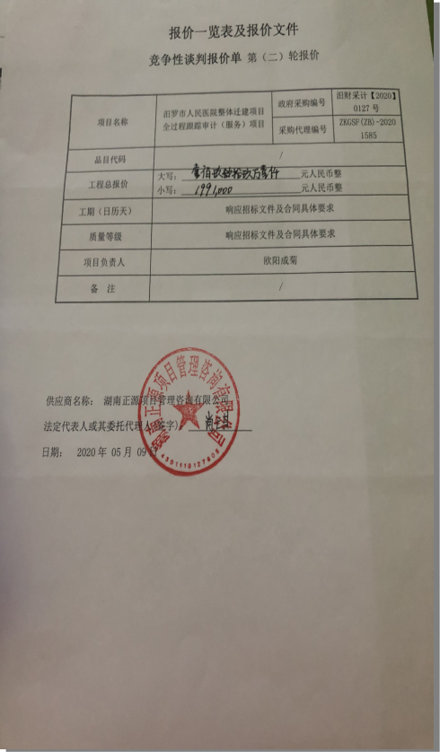 采购人:湖南省楚之晟控股实业集团有限公司 业主:汨罗市人民医院 的汨罗市人民医院整体迁建全过程跟踪审计(服务)项目 竞争性谈判采购项目于2020年05月 09日结束,现将成交结果公告如下:
