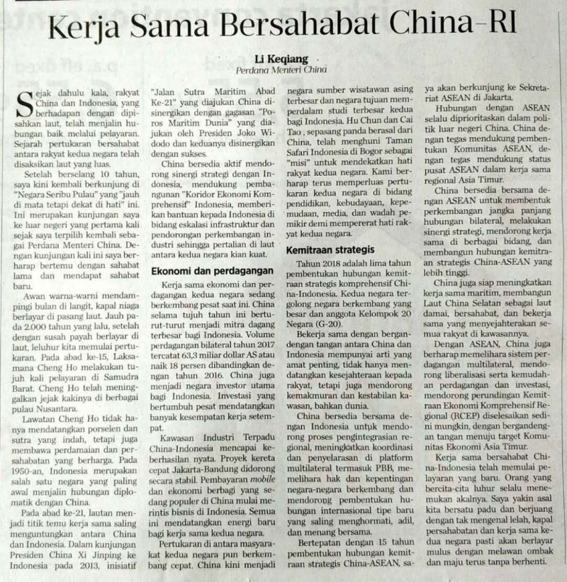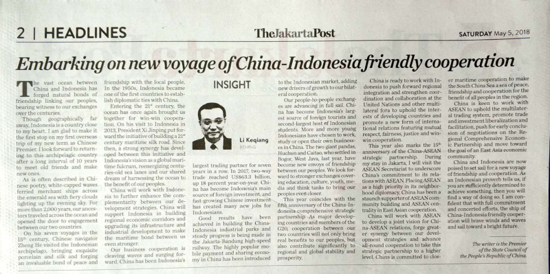 5月5日,李克强总理在印尼最具影响力的印尼文报纸《罗盘报》和英文报纸《雅加达邮报》发表署名文章《开启中印尼友好合作的新航程》。全文如下: