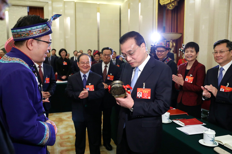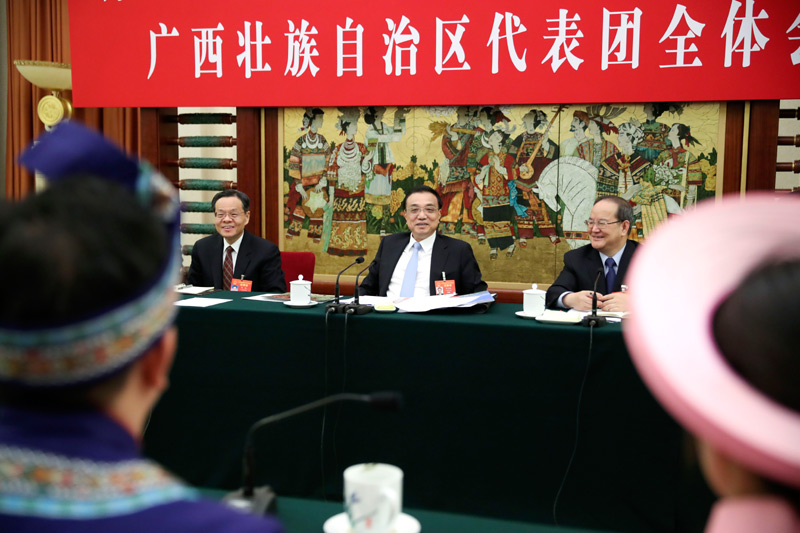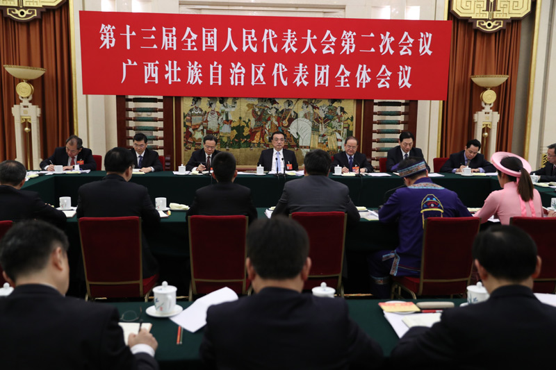 新华社北京3月6日电 中共中央政治局常委、国务院总理李克强6日上午来到他所在的十三届全国人大二次会议广西代表团,参加审议政府工作报告。鹿心社、陈武、刘入源等代表就经济社会发展、沿边开发开放、脱贫攻坚等问题先后发言。李克强与大家交流讨论,现场气氛热烈。李克强在发言中说,去年在以习近平同志为核心的党中央坚强领导下,广西与全国一样,经济社会发展取得来之不易的新成绩,不少经济指标增速超过全国平均水平。希望广西深入贯彻习近平总书记关于广西工作的重要指示精神,增强“四个意识”、坚定“四个自信”、做到“两个维护”,落实党中央、国务院决策部署,发挥区位、市场等独特优势,勇于担当,扎实苦干,乘势而上,推动经济社会发展再上新台阶。