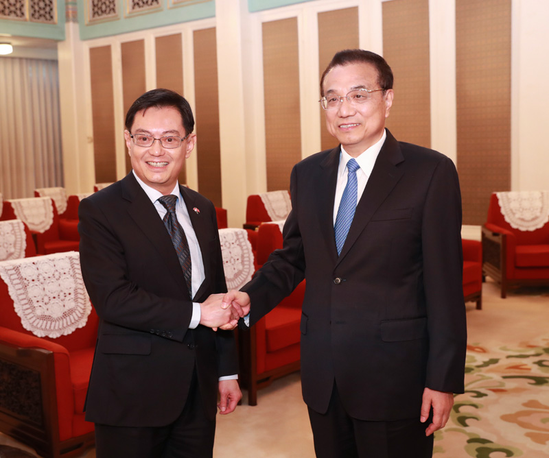 李克强表示,当前中新关系发展势头良好。中方愿同新方继续密切高层交往,将“一带一路”倡议同新方发展战略更好对接,发挥好两国副总理级双边合作机制作用,推进“陆海新通道”和第三方市场合作,深化贸易投资、金融、智慧城市以及中国地方省市同新加坡的合作,推动两国关系与合作再上新台阶。