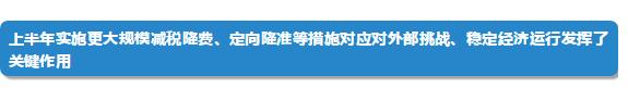 李克强指出,上半年实施更大规模减税降费、定向降准等措施对应对外部挑战、稳定经济运行发挥了关键作用。要坚持实施积极的财政政策、稳健的货币政策和就业优先政策,适时预调微调,运用好逆周期调节工具。要切实兑现全年减税降费近2万亿元的承诺,稳定企业预期。疏通货币政策传导渠道,降低中小微企业融资成本。做好就业服务、高职扩招等工作,适应灵活就业健全相关社会保障,多措并举稳定和扩大就业。