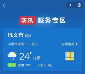 打开小程序“防汛服务专区”,将自动定位你的所在地,精确到市辖区(县级市、县级区),天气情况打开即见!