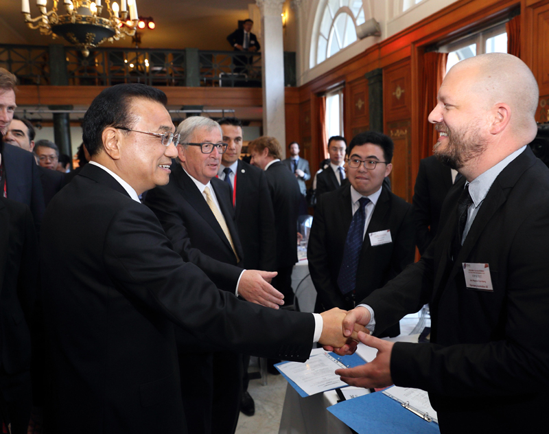 当李克强和容克步入会场时,来自中国和欧盟成员国的几十位中小企业家正在热烈讨论合作事宜。李克强和容克加入他们的讨论,询问他们创业的领域、进展、双方合作意向等问题。两位领导人还同分会场的中欧企业家进行视频连线,饶有兴致地听取双方对接合作情况介绍。