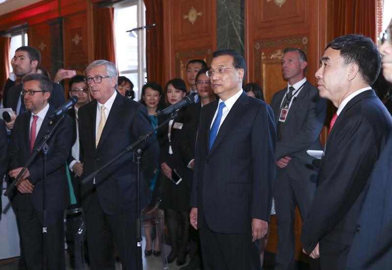 国务院总理李克强当地时间6月2日上午在布鲁塞尔埃格蒙宫与参加中国-欧盟中小企业合作对接会的代表互动交流。欧盟委员会主席容克陪同参加。