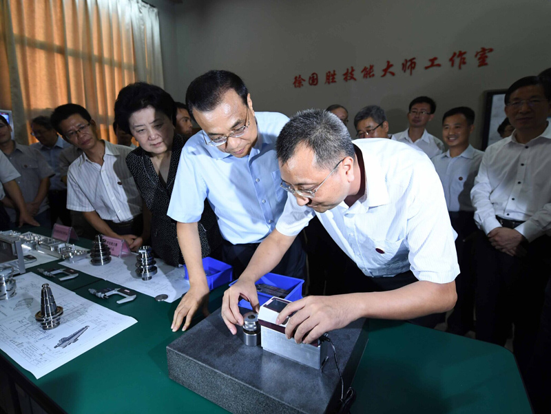 学校拥有几十位国家级和天津市技能大师,并与相关企业合作成立国家级技能大师工作室。李克强来到这里,详细了解他们的创新成果,并亲自按下操作键检测产品表面光洁度,对所达到的高精密度表示赞许。李克强说,实施创新驱动发展战略,既要鼓励创造,又要能把好的创意变成高质量的产品。现在在一些方面技术上可以做到精细,但在大批量生产产品时往往就有明显差距,影响了消费者对中国制造的感受和信心。希望通过发展现代职业教育和高水平的技能大师带动,培养出更多高素质的专业人才,让精益求精的工匠精神遍布中国各类型、各领域的企业,深入每一个制造环节和每一道工序,使大中小企业都能生产出精细化产品,成为带动中国制造跃升的重要支撑力量。一名在校创业学生送给总理一张激光雕刻的卡片,上面刻着今年政府工作报告提出的“质量之魂,存于匠心”,李克强肯定道,有匠心才有品质,做得好那才是中国制造。