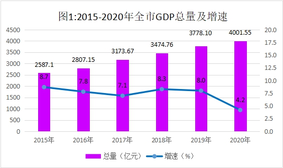 根据地区生产总值统一核算结果,全年地区生产总值4001.55亿元,总量居全省第二,比上年增长4.2%,比全国、全省平均水平分别高1.9、0.4个百分点。其中:第一产业增加值459.91亿元,增长3.8%;第二产业增加值1622.25亿元,增长5.0%;第三产业增加值1919.39亿元,增长3.7%。分季度看,一季度地区生产总值同比下降3.4%,二季度增长5.1%,三季度增长6.2%,四季度增长7.6%。三次产业结构为11.5:40.5:48.0。