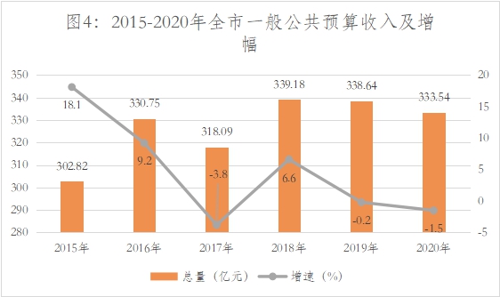 全年全市一般公共预算收入333.54亿元,比上年下降1.5%,其中:税收收入274.89亿元,下降2.9%。一般公共预算地方收入152.73亿元,比上年增长1.7%,其中:税收收入95.55亿元,下降0.6%。