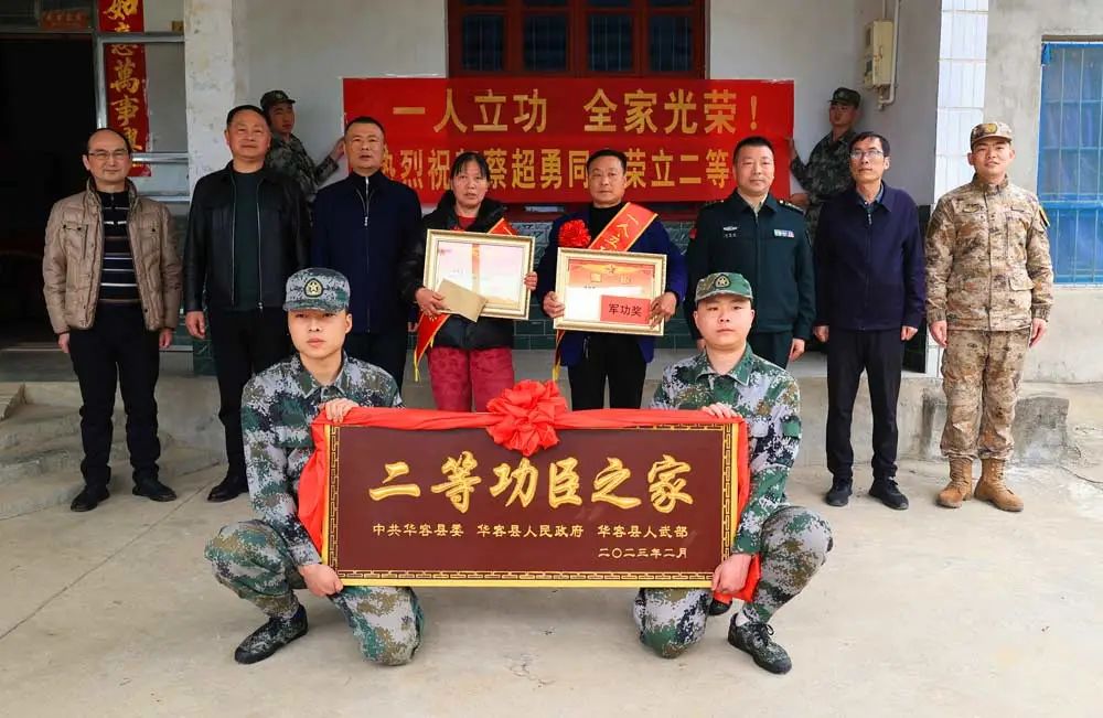 3月1日,在章华镇栗树村,送喜报现场鞭炮齐鸣、热闹非凡,华容县人民武装部携手县退役军人事务局向2022年度荣立二等功、三等功的军人蔡超勇家庭送上立功喜报、“二等功臣之家”牌匾和奖励金,让军人、军属、家乡父老共享这份荣誉。