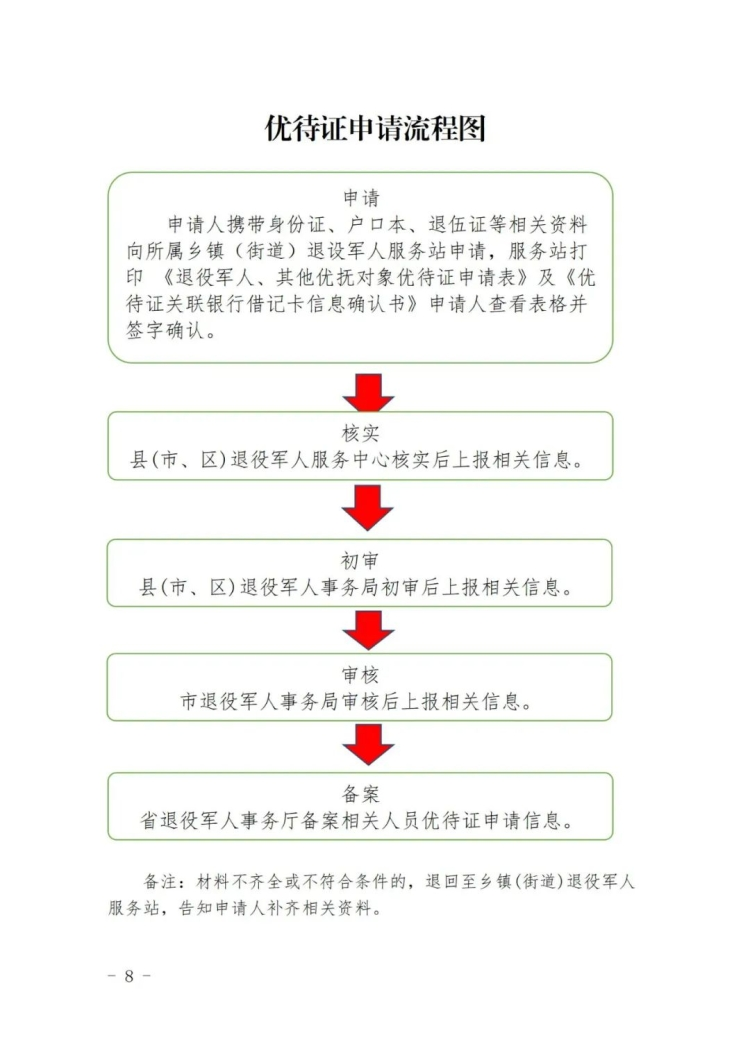(四)优待证申请受理后,系统提交县、市、省退役军人事务部门和合作银行审核通过后,由相应银行制卡工厂制作《优待证》。