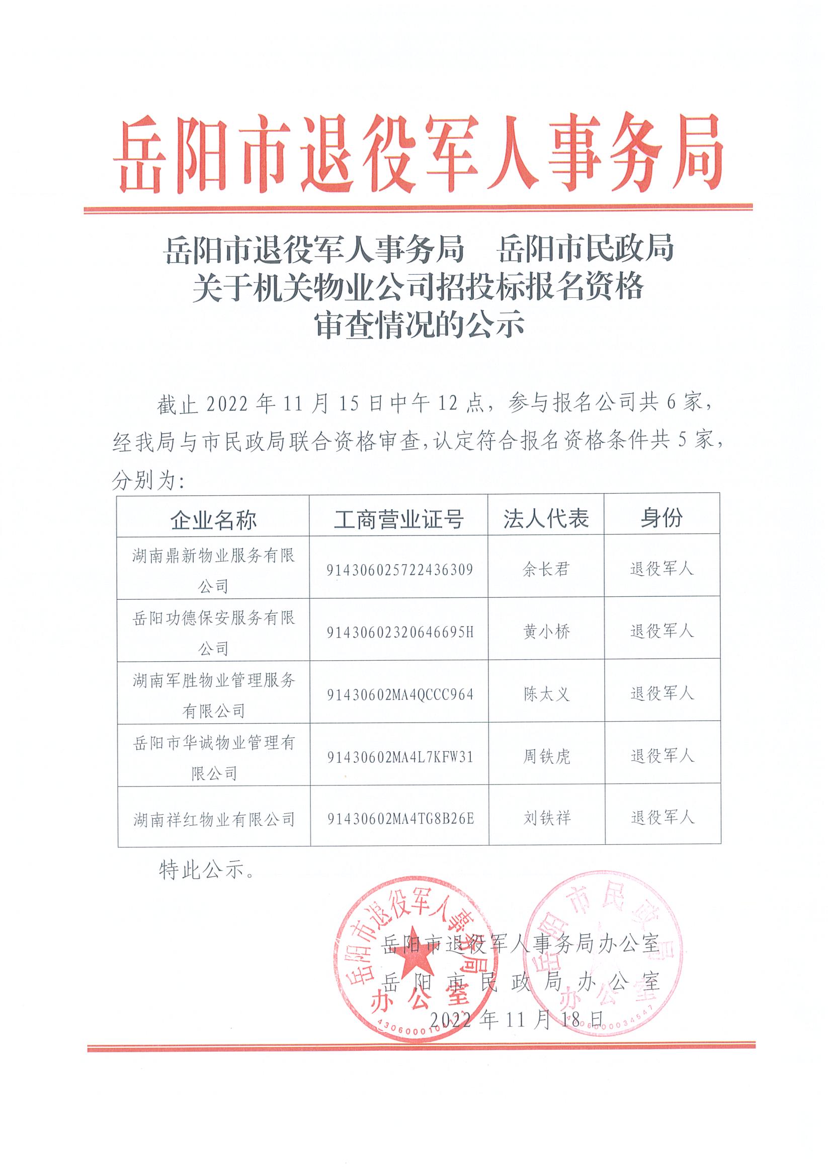 岳阳市退役军人事务局 岳阳市民政局 关于机关物业公司招投标报名资格审查情况的公示
