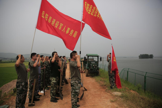 2020年7月16日,一支由35名退役士官组成的防汛突击队在新开站古港垸集结,县委副书记王保林亲自为突击队授旗。