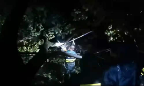 “文胜北路主干道被倒塌大树及电线杆阻断,请迅速驰援!”当晚灾情时刻,接武装部紧急抢险救灾通知,岳阳县退役军人事务局副局长傅湘江(志愿队队长)迅速组织退役军人志愿者10人奔赴县武装部集结。21:40接到通知,22:00集结完毕。志愿者队伍全由退役军人组成,平均兵龄12年以上。当傅湘江队长接的命令的时候由于下午肾结石发作疼的晚上8点许送岳阳县人民医院进行急救,刚从急救室出来接到通知对护士说了一句“给我几片止痛药,我马上要执行任务去!”护士看到这个疼的衣服都湿透的人不解的问道:“你现在状态不能动,应好好休息。”“不行!队员现在等着我,老百姓在等着我”说完拿了止痛片就赶往集结点。