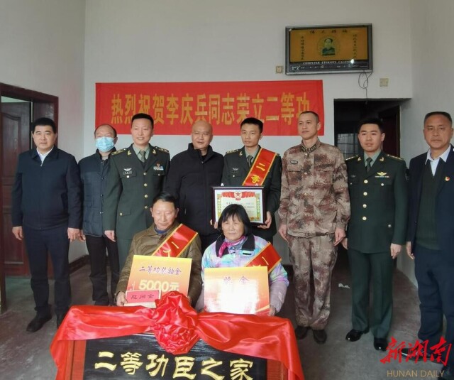湖南日报·新湖南客户端2月24日(通讯员 曹桢健)2月24日,春回大地,晴空万里,临湘市桃林镇苎麻社区锣鼓喧天,乡亲们热闹的聚集在一起,好不欢喜。究竟是什么事,让这个小乡村如此热闹呢?原来,该社区走出去的军官李庆兵,载誉归来了。当天,部队的领导和临湘市相关单位负责人特意为李庆兵送来二等功臣之家的牌匾和慰问金,亲切地为李庆兵的父母戴上了光荣军属的绥带。