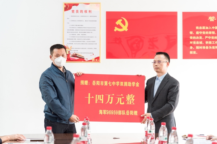 记者了解到,为进一步弘扬拥军爱民的光荣传统,发扬新时代军地共建精神,中国人民解放军海军决定授予岳阳市七中为“海军爱民学校”。活动现场,海军岳阳舰副政委李岳安为“海军爱民学校”授牌,并现场捐赠14万元的双拥助学金,体现岳阳舰全体官兵对英雄母校的关怀与支持。