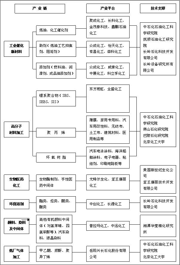 集聚一批中小企业。以长岭炼化为主要原料基地的企业集聚到长炼特色化工基地;其它精细化工企业集聚到云溪工业园(含岳化工业区);农药及相关企业集聚到儒溪工业园;链接一批特色企业。在三个化工专业园区逐步形成并壮大工业催化新材料、高分子材料加工、生物医药化工、环保溶剂、中间体产业、炼厂气体加工等六条产业链。淘汰一批落后企业和生产装置。包括长岭炼化的150万吨/年原油蒸馏装置和100万吨/年重油催化裂化装置,对工艺落后、污染严重、耗能过大的小企业坚决关停并转。