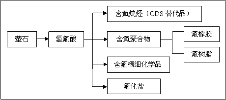 ——氟化工产品的市场发展趋势分析。氟化工产业链的基本结构如下图所示,萤石是生产氢氟酸的原料,氢氟酸是整个氟化工产业的基础产品。氢氟酸主要用于生产四类产品:一是含氟烷烃(ODS替代品),主要有CFC (全取代氟氯烷烃)、HCFC (含氢氟氯烷烃)、HFC (氟代烷烃)、HBFC (氟溴代烷烃)等;二是含氟聚合物,主要有PTFE (聚四氟乙烯)、FKM(氟橡胶)、FEP (聚全氟乙丙烯)、PVDF(聚偏氟乙烯)等;三是含氟精细化学品,主要有含氟中间体、含氟表面活性剂等;四是氟化盐,主要有氟化铝、氟化钠等。