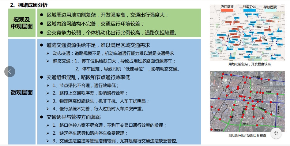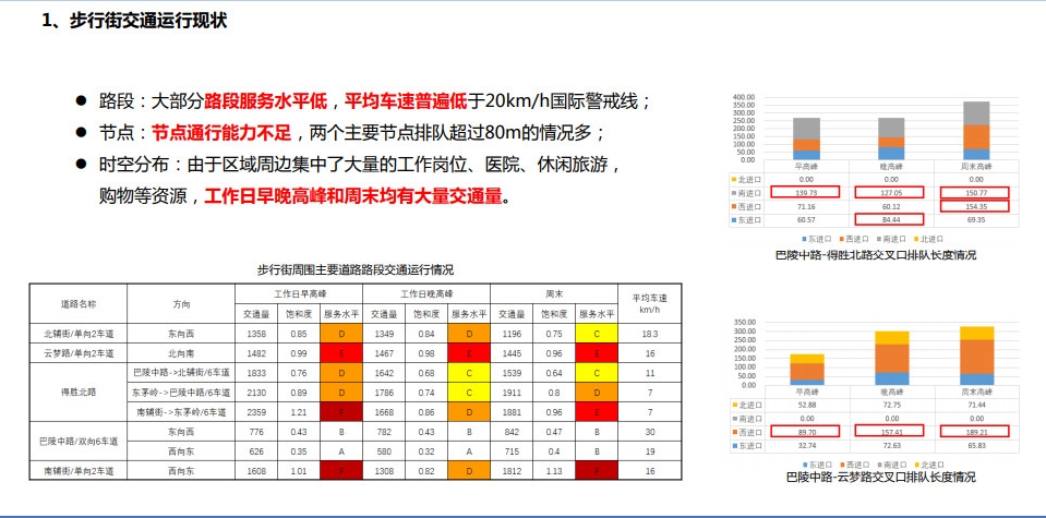 据调查,由于区域周边路网结构不完善,节点通行能力不足,平均车速普遍低于20km/h国际警戒线,节点排队车辆超过80米以上的情况非常多见。加上周边区域停车位供给缺口大,停车困难导致司机“低速寻位”现象增多,并占用过多路面资源停车。