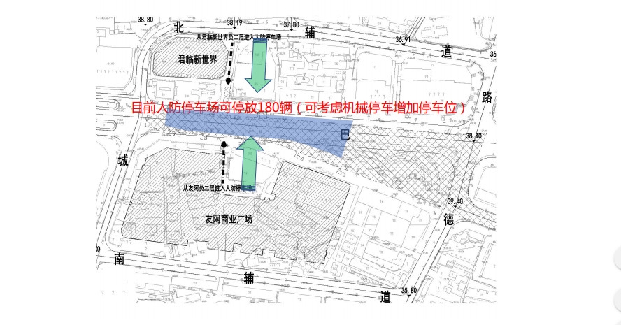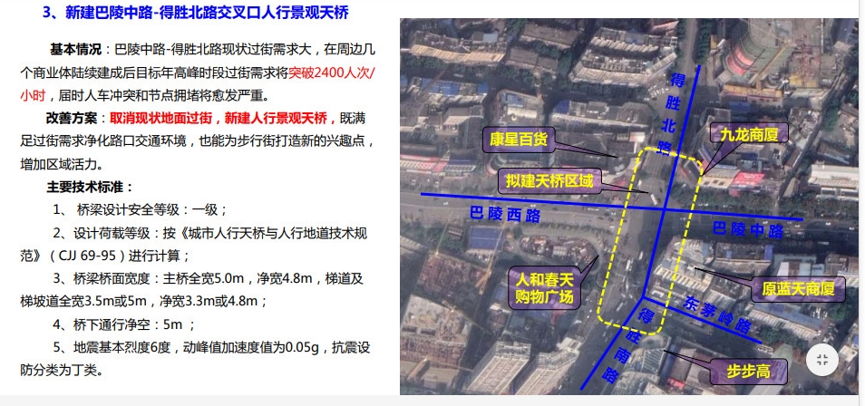 方案将启用人防工程地下停车场,并推动周边地下停车场互通,尽可能将步行街区域的停车向地下转移,减轻地面交通压力,腾出道路空间。改善并启用人防工程地下通道,供行人和慢行交通过街。新建巴陵中路——得胜北路交叉口人形景观天桥,天桥平面整体外形灵感来自“岳阳”拼音首个字母“y”,与当地文化特色相契合,既满足过街需求净化路口交通环境,也能为步行街打造新的兴趣点,增加区域活力。