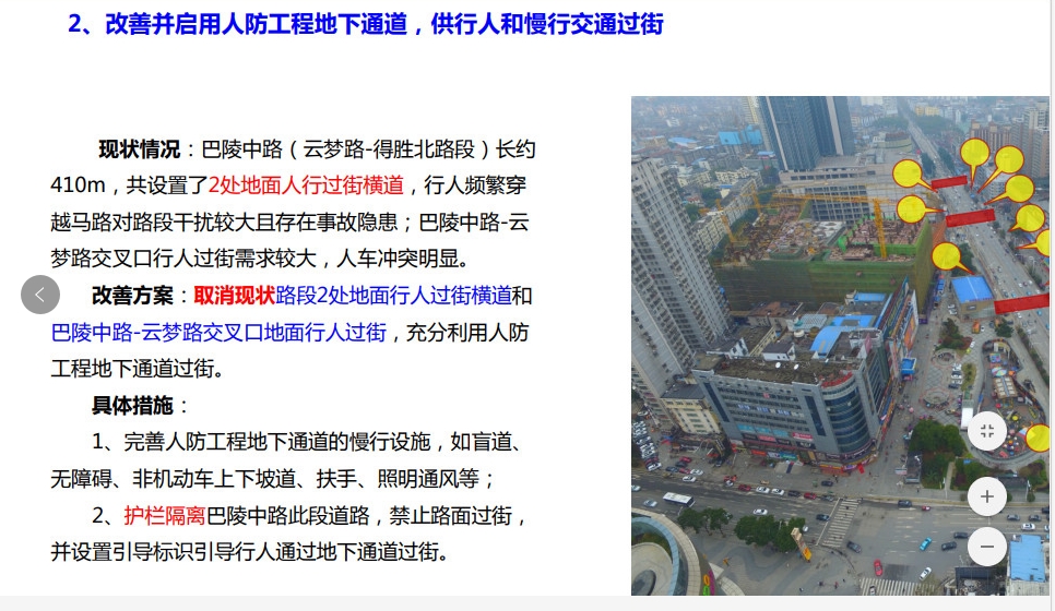 同时,对巴陵中路改造为双向8车道断面,最外侧车道为公交专用道,非机动车改为与行人共板;取消部分南北辅街路内停车,分配道路资源给慢行和机动车;重新论证南北辅街现状单向交通组织合理性,优化交通组织。