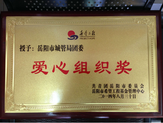8月30日,共青团岳阳市委举行2014年岳阳市希望工程助学金集中发放仪式。会上,岳阳市城管局团委被共青团市委授予“爱心组织”荣誉称号。
