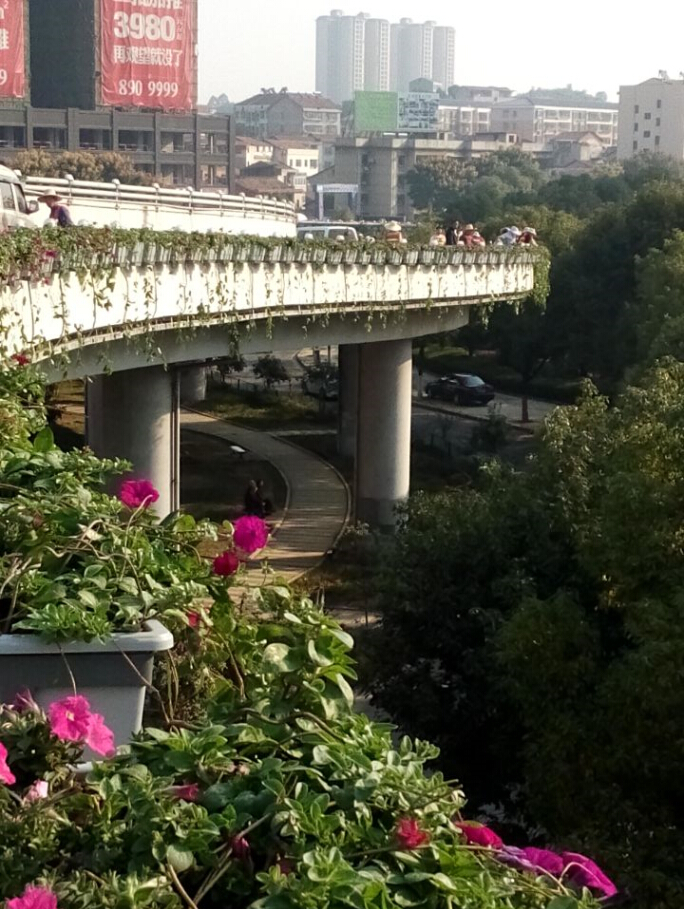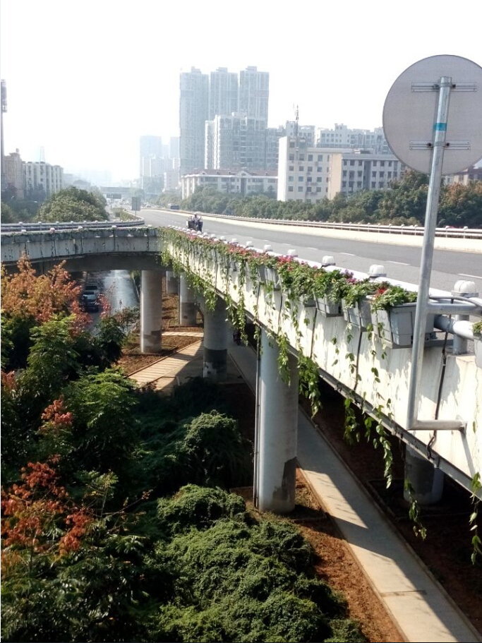9月中旬岳阳市风景园林局组织对琵琶王立交桥立体绿化进行施工,于10月27日顺利竣工了。这是我市首次尝试对立交桥进行规模绿化,也是我市今年造绿工程的重要举措之一。立体绿化采用钢结构支架、挂置式PP花箱和先进的滴灌系统,花箱内栽满了五颜六色的垂吊矮足牵牛花和常绿油麻藤,绿茵茵的油麻藤垂下1米多长的“青丝”,遮住了往日灰暗而光秃秃的的水泥护栏,加上色彩斑斓的鲜花点缀,整个立交桥的边缘光彩夺目,美不胜收,如同一条条彩带,与整个城市靓丽的面貌显得格外和谐。