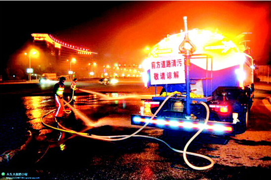 在冲洗过程中,环卫工人发扬不怕苦、不怕累的奉献精神,不论白天还是晚上,他们都积极配合冲洗车开展清洗道路工作,力求有效地遏制道路扬尘、改善市区空气质量,为市民营造干净整洁的生活环境。