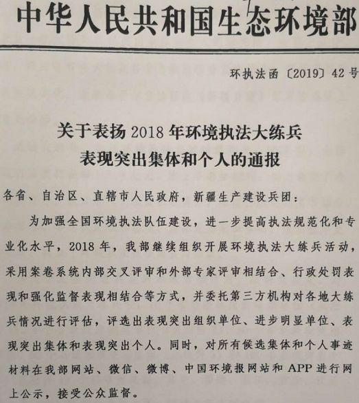 2018年,生态环境部组织开展环境执法大练兵活动,采用案卷系统内部交叉评审和外部专家评审相结合、行政处罚表现和强化监督表现相结合等方式,并委托第三方机构对各地大练兵情况进行评估,评选出10个省级表现突出组织单位、4个省级进步明显单位、30个市级表现突出集体、60个县级表现突出集体和100名表现突出个人。