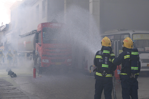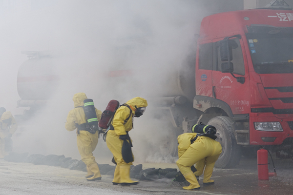 演练假定灾情:9时50分,一辆运载盐酸的危险化学品槽罐车突然失控,撞向西塘加油站防护栏和加油机,加油机被撞倒起火,槽罐车封头焊缝开裂,罐内盐酸从裂缝向外流出,产生大量的盐酸酸雾,情况非常紧急。在接到报警后,全区迅速启动突发事故灾难专项应急预案,并于第一时间出动消防、交警、安监、卫生、环保等多个部门及专业救援队伍到场进行处置。演练中参战指战员严格规范安全处置程序,按照危险区域等级划分和安全防护要求,侦检组联合安监部门对现场泄漏点开展检测,救援组使用水枪水雾稀释、压制盐酸酸雾,防止酸雾继续扩散。同时,公安、交警对交通道路进行封闭将周围人民群众疏散至安全区域,医疗人员及时将救出伤员进行医疗救护和转移。30分钟后,此次事故在全体救援人员的共同努力下得到成功处置。